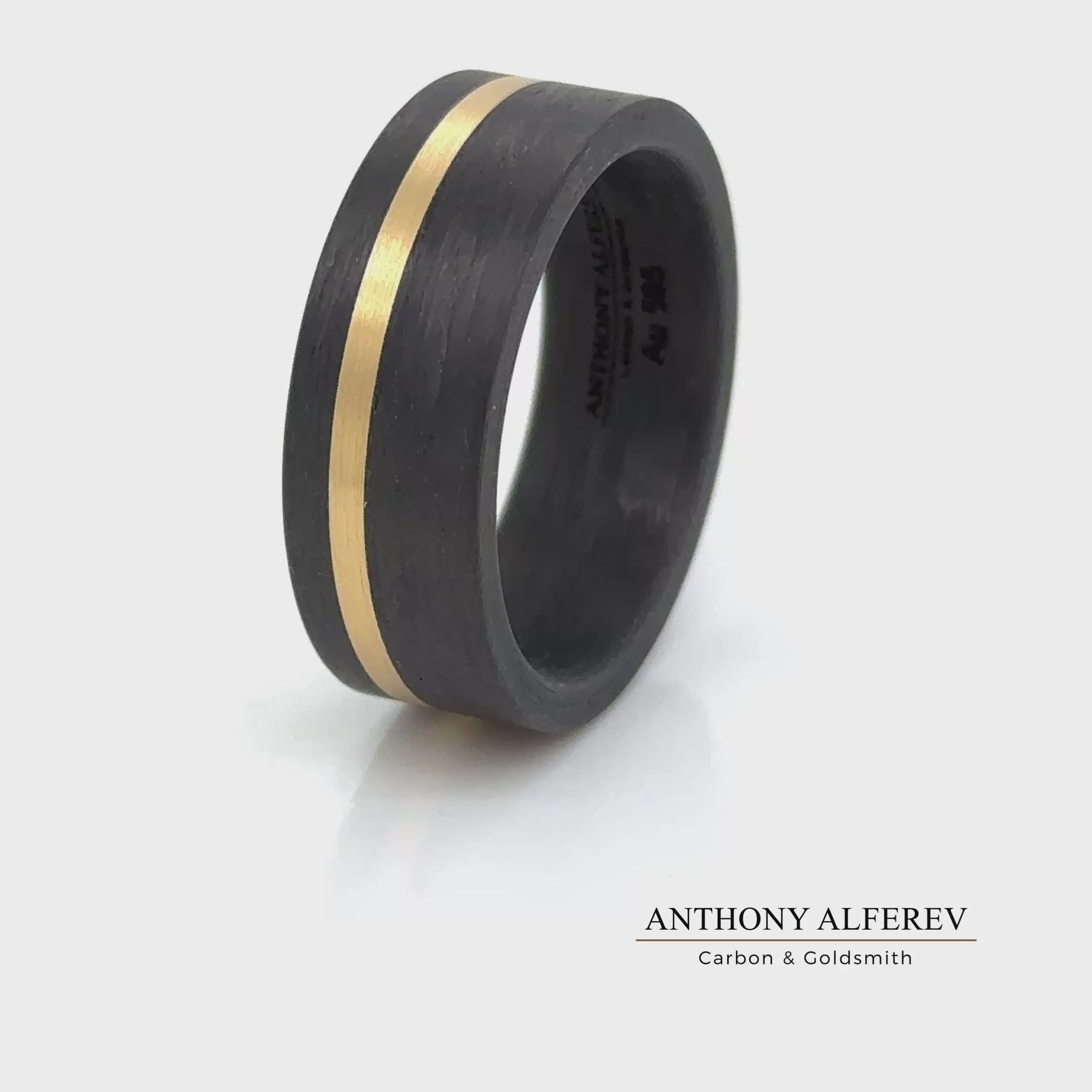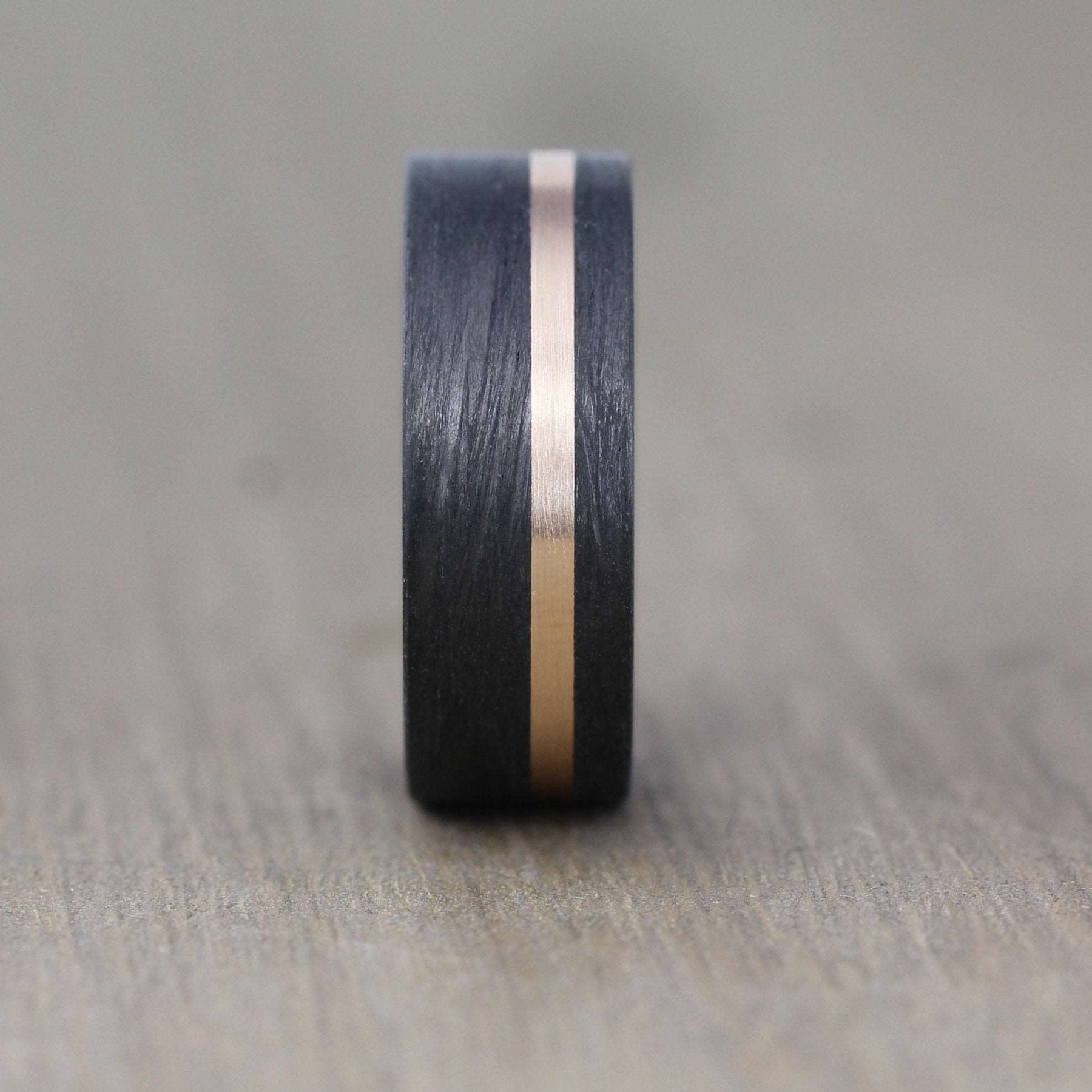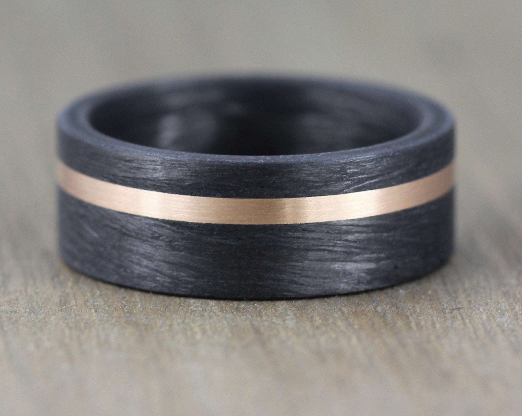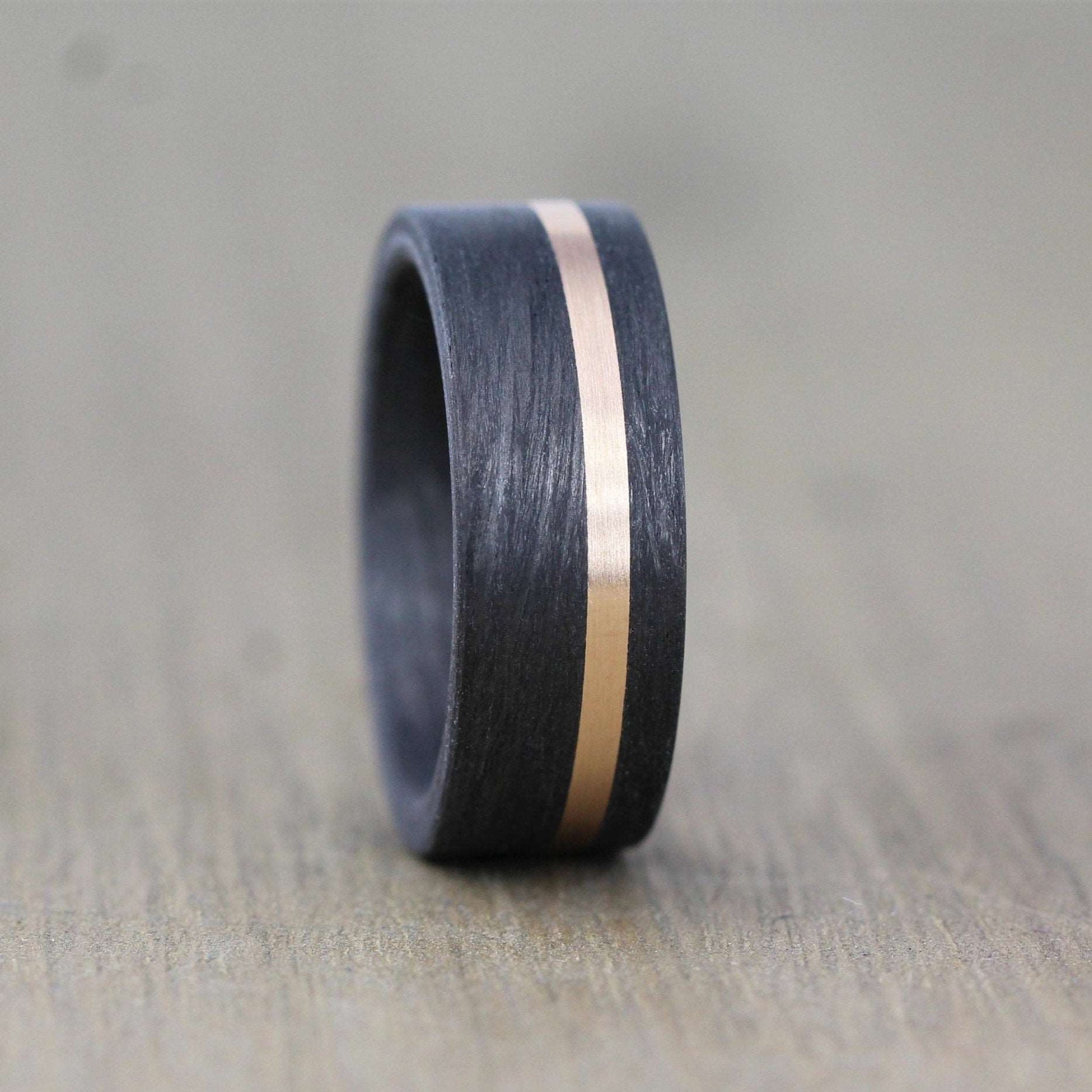 8mm, Carbon Fibre and Rose Gold Wedding ring band with a satin inside that is perfect for personalized engraving.
