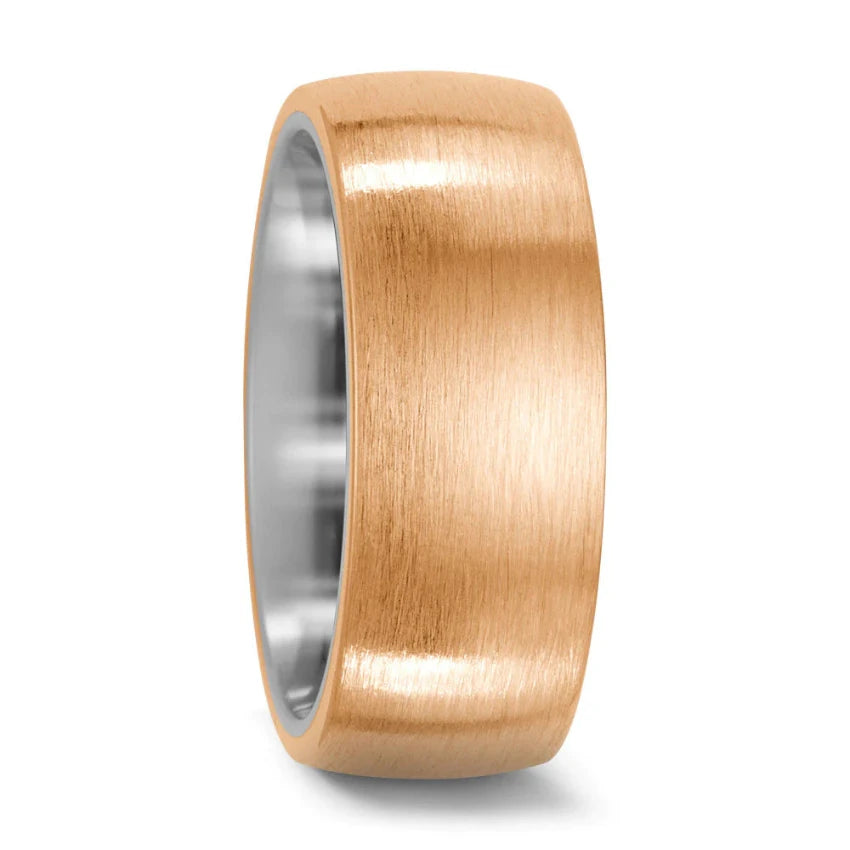 Looking for a unique wedding ring band? This Matte Bronze Men's wedding ring has a Titanium inner sleeve. Bronze has a similar look to Rose Gold.